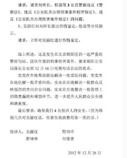 刘萍今天早晨曾在微博上表示,这次除了要在2012年新年的第一时间前往临沂旅游外,还要追究上次旅游时被沂南双堠派出所07697警察殴打抢劫至伤的法律责任。刘萍曾在11月2号在临沂公安局、沂南县公安局、蒙阴派出所、双堠派出所分别报警要求立案,要求山东临沂方面给一个说法,但至今没有答复。